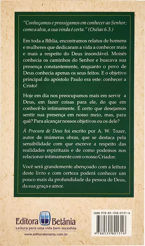 À Procura de Deus foi escrito por A. W. Tozer, autor de inúmeras obras, que se destaca pela sensibilidade com que escreve a respeito das realidades espirituais e de como podemos nos relacionar intimamente com o nosso Criador.