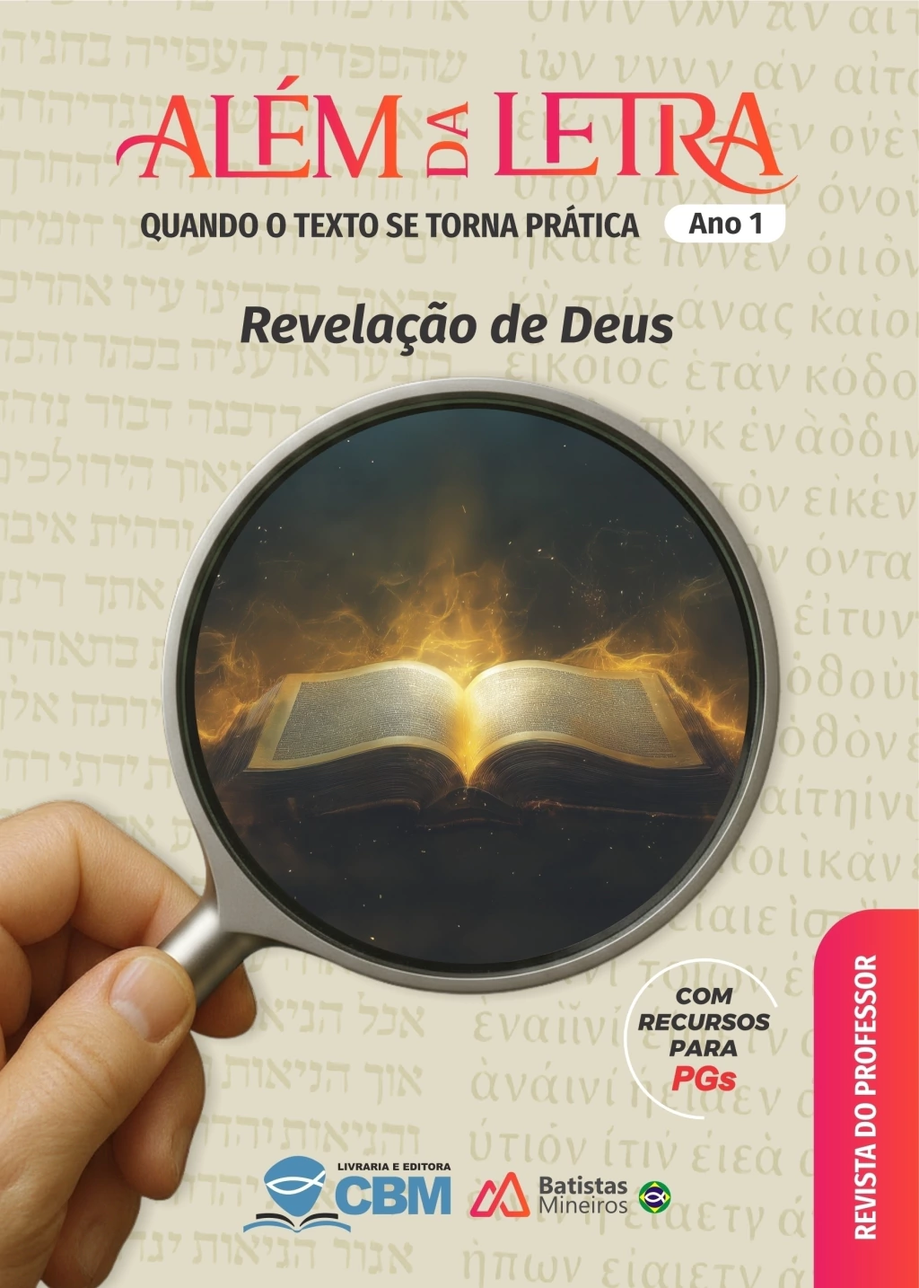 Esta é a primeira revista do novo currículo bíblico da Editora da Convenção Batista Mineira, Além da Letra , um conjunto de cinco revistas que oferece uma visão panorâmica e profunda de toda a bíblia. Revelação de Deus apresenta 52 estudos que percorrem toda história sagrada, unindo profundidade teológica a uma forte ênfase na aplicação prática. Os estudos abordam: a criação, e a queda ( 1 a 8 ) ; patriarcas (9 -12 ); o êxodo e a liderança de Moisés e Josué (13-16); a conquista e a monarquia (17-21); do reino unido ao exilio ( 22-26) ; e a restauração pós – exilio ( 27-30).Examinam também a vida de Jesus (31 – 39),a igreja primitiva ( 40 - 44)., as cartas paulinas (45 – 48), as cartas gerais e o Apocalipse ( 49 – 52 ) . Traz ainda textos introdutórios aos antigo testamento e Novo testamento.