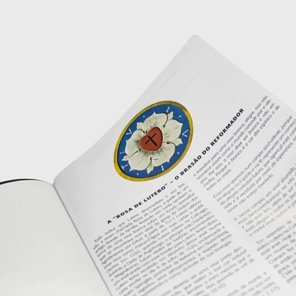 * Introdução aos grupos de livros e a cada livro bíblico: Cada livro bíblico é precedido por uma ampla introdução, que traz informações sobre o livro (autor, data, propósito) e outros elementos importantes (lugares, personagens, temas de lei e de evangelho). Além disso, traz o pensamento de Martinho Lutero sobre o referido livro, aponta temas que são desafiadores e que trazem bênção para o leitor, encerrando com um amplo esboço de conteúdo. *Mais de 40 mil notas de rodapé: Explicam termos ou frases específicos (em itálico) ou fornecem informações variadas sobre a Bíblia, como História, Geografia, cultura, características literárias e Teologia. Algumas notas trazem palavras transliteradas do hebraico, aramaico ou grego. * 2 mil notas de aplicação de lei e evangelho: Resumem as seções do texto bíblico, aplicando para o leitor tanto lei como evangelho e fornecendo um motivo para que a pessoa ore, pedindo ou agradecendo. Com isso, a leitura e o estudo da Bíblia tornam-se um momento devocional, com crescimento e comunhão com Deus. * Referências cruzadas: Indicam outros lugares na Bíblia em que aparece a mesma ideia. * Referências internas: As notas de estudo muitas vezes remetem o leitor a outros recursos desta Bíblia, como introduções, artigos, gráficos, mapas e outras notas. Essas referências ajudam o leitor a aprofundar-se no estudo. Há, ainda, um Guia de Referência, que facilita a localização do tema e texto de interesse. * Cerca de 120 quadros, mapas e diagramas. * Mais de 220 artigos e introduções aos livros e tópicos bíblicos. * Citações dos Pais da Igreja: Inúmeros pensamentos extraídos do Livro de Concórdia, bem como da obra de escritores cristãos antigos, medievais e da era da Reforma, foram incluídos para dar ainda mais peso e profundidade às notas. * Mapas coloridos. * Ícones com ênfases teológicas: Três ícones diferentes apontam para passagens importantes na Teologia: - O ícone Trindade marca passagens sobre o Deus Triúno e profecias messiânicas no Antigo Testamento. - O ícone Palavra e Sacramentos destaca passagens sobre os meios da graça. - O ícone Missão indica passagens sobre a pregação do evangelho. Notas de aplicação de lei e evangelho, resumem as seções do texto bíblico, aplicando para o leitor tanto lei como evangelho e fornecendo um motivo para que a pessoa ore, pedindo ou agradecendo. A Rosa de Lutero: Conheça, a seguir, o significado de cada elemento desse símbolo, utilizado com destaque na capa desta edição da Bíblia. - Cruz (preta): no centro da rosa, lembra que Deus vem ao nosso encontro com o seu amor por meio de Jesus crucificado. - Coração (vermelho): significa que Cristo agiu na nossa vida por meio da cruz, e que ela recebe novo sentido, se Cristo for o seu centro. - Rosa (branca): significa que, quando a cruz de Cristo tem lugar em nossa vida, ocorre uma transformação que traz verdadeira paz e alegria. A cor branca representa o Reino de Deus. Todas as promessas de Cristo também são representadas por essa cor. - Fundo (azul): Deus está conosco. Podemos viver com e para Deus, como sinais de seu Reino, já aqui e agora. Mas a cor azul é também esperança no futuro, pois lembra a eternidade. - Anel (dourado): o ouro é o metal mais precioso. Este anel representa as dádivas que recebemos por meio da cruz e ressureição de Jesus. A vida para a fé e o amor a serviço de Cristo é o que temos de mais precioso.