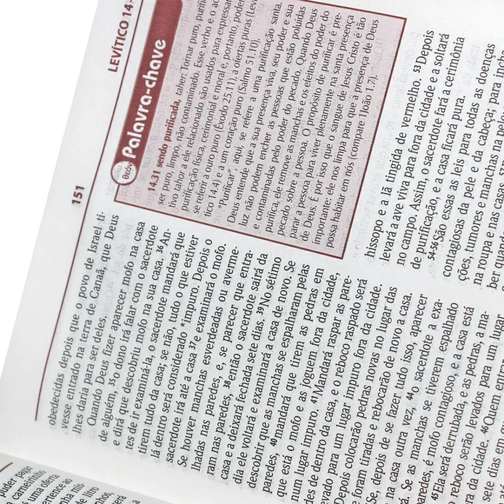 Além disso, esta Bíblia conta com introduções aos livros bíblicos, notas explicativas, referências, mapas, quadros e vocabulário, tornando o estudo ainda mais completo. Para apoiar a jornada espiritual, oferece guias como “O que a Bíblia diz sobre o perdão de Deus” e “Como encontrar ajuda na Bíblia”, além do plano Leia a Bíblia em um ano.