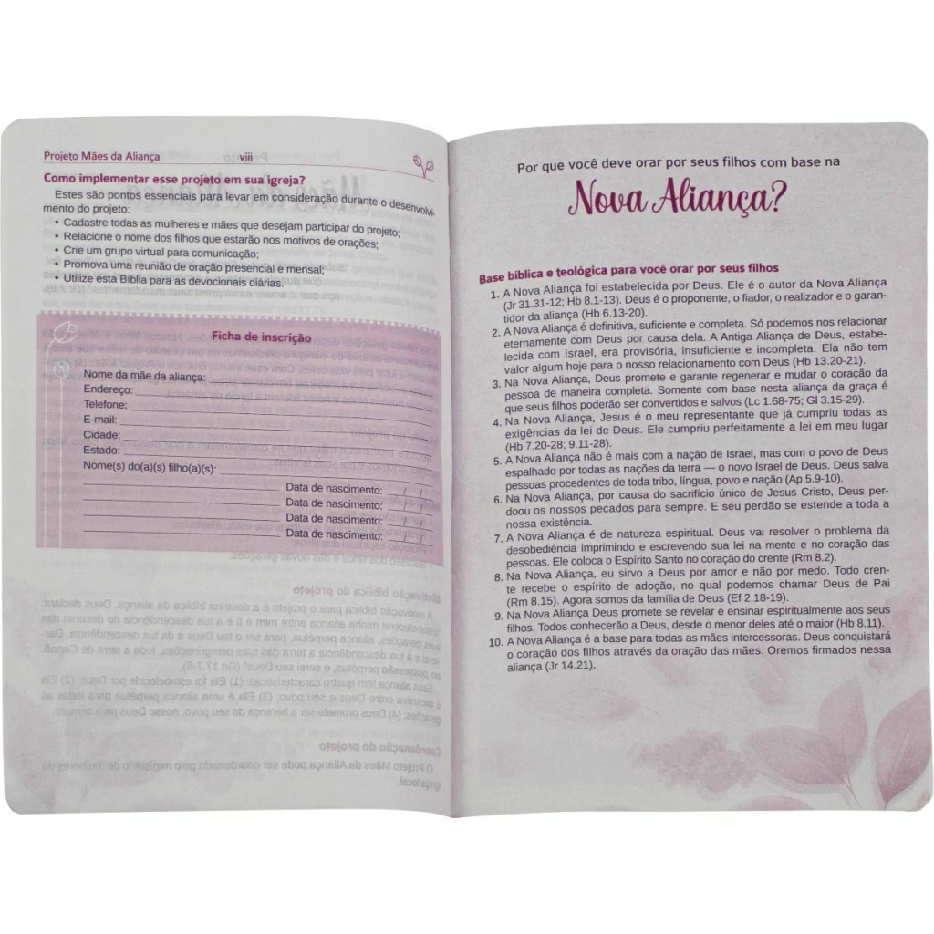 A Bíblia Mães da Aliança foi criada especialmente para atender o coração de milhares de mães crentes pelo Brasil, que oram diariamente e com perseverança pelos seus filhos. Seja você mãe biológica, espiritual, avó ou tia, esta edição é um verdadeiro suporte para sua missão de intercessão.